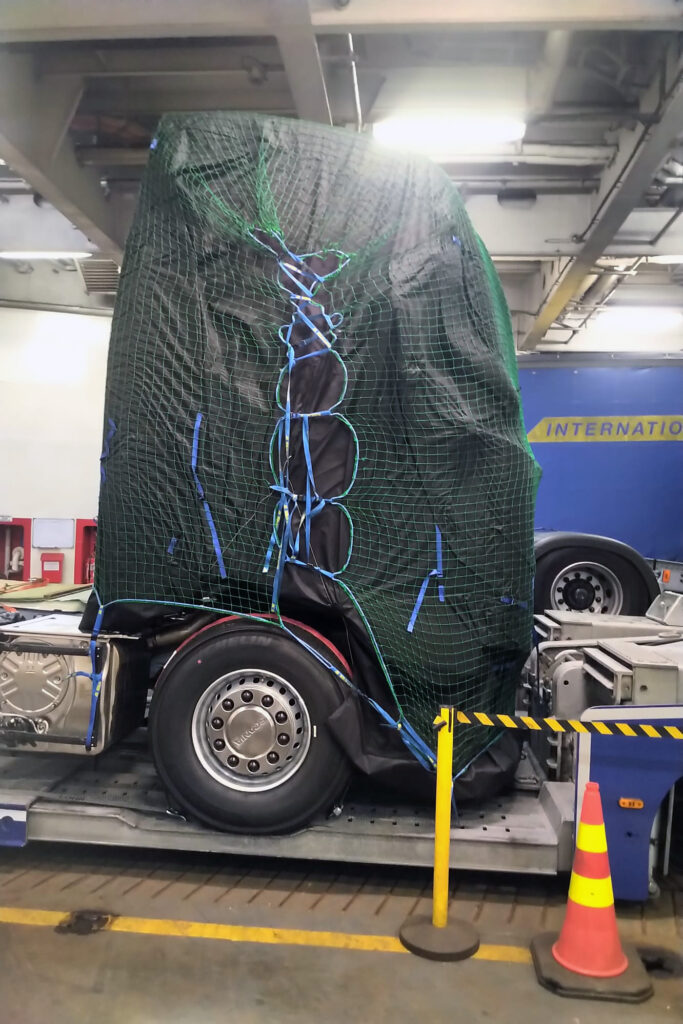 Yeniden tasarlanmış bir ön gövde sahip Baltık Denizi’ndeki bir feribotta başka bir gizem daha ortaya çıktı. Aracın, Scania’nın en büyük Avrupa fabrikasının bulunduğu ve aynı zamanda aerodinamik testlerin yapıldığı rüzgar tüneline sahip Zwolle (Hollanda) şehrine gönderildiği tahmin ediliyor.