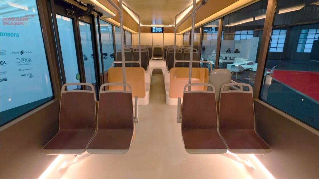 İç mekânda hem sürücülerin hem de yolcuların konforu ön planda tutulmuş. Sürücü kabini konfor ve görüş alanı açısından optimize edilirken, yolcu bölümü sürdürülebilir ve geri dönüştürülmüş malzemelerle tasarlandı. Enerji verimliliği için hafif yapılar tercih edilirken, yumuşak dokular, sıcak renk tonları ve özenli aydınlatmalarıyla lüks bir salon havası var.